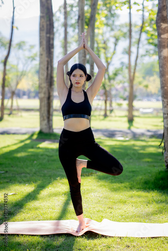 A woman is doing yoga in a garden with trees.