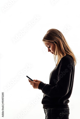A woman is engrossed in her cell phone, her focus evident as she interacts with the device. Set against a clean white background