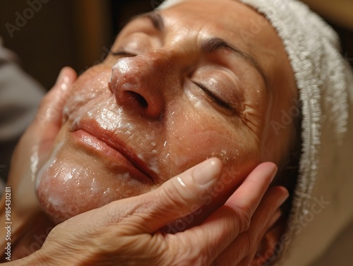 A woman is getting her face washed with a facial cleanser