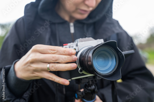A woman is holding a camera and making settings for shooting a video, close-up lens