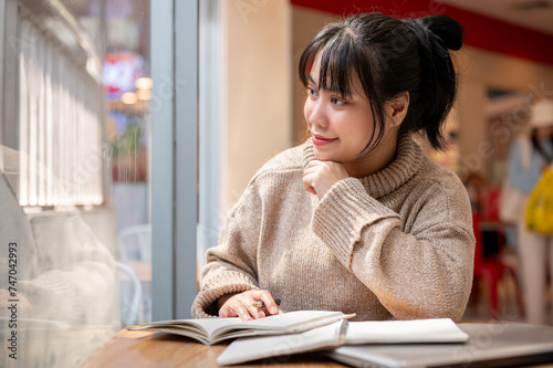 A woman is looking out the window and daydreaming while reading a book in a coffee shop.