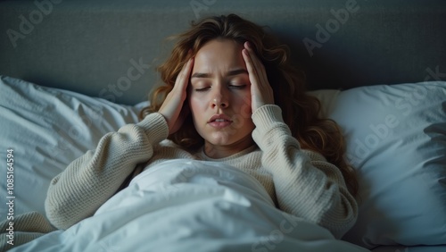 A woman is lying in bed, rubbing her temples due to a headache. She appears to be in a cozy room with soft bedding, struggling to find comfort in the quiet gloom of the morning