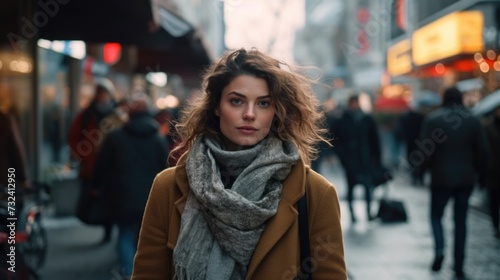 A woman is pictured walking down a street wearing a coat and scarf. This image can be used to depict winter fashion or urban lifestyle