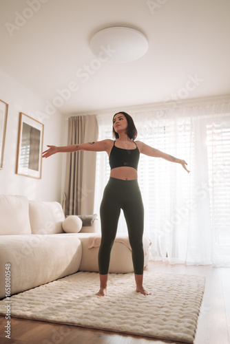 A woman is practicing yoga in a bright and airy living room filled with natural light