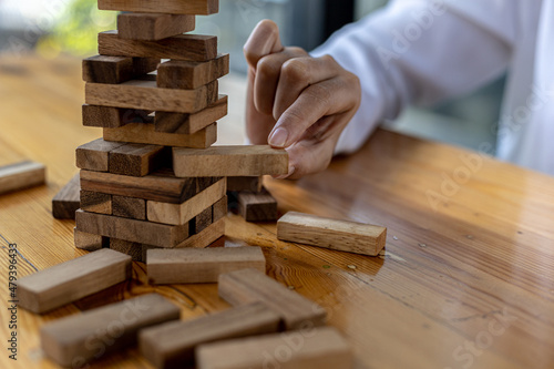 A woman is pulling a block of wood from a row and not breaking it down, like running a good business and solving problems. The concept of business management on risk.