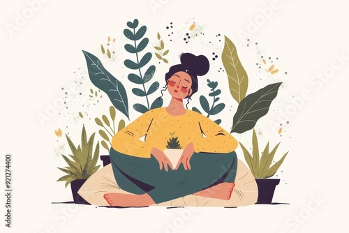 A woman is seated in a lotus position among various plants, Illustrations of the importance of rest and self-care in maintaining a healthy work-life balance