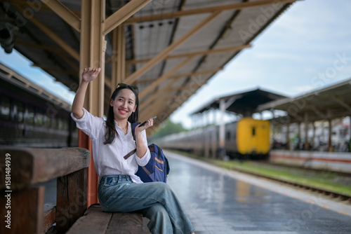 A woman is sitting on a bench at a train station with a backpack on her lap