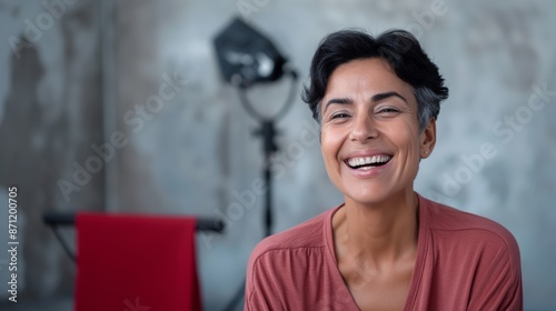 A woman is smiling and wearing a red shirt. She is sitting in front of a red chair