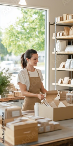 A woman is smiling and working in a store with a lot of boxes. Scene is cheerful and positive
