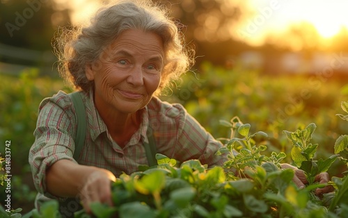 A woman is smiling while tending to a garden. The garden is full of green plants and the sun is shining brightly