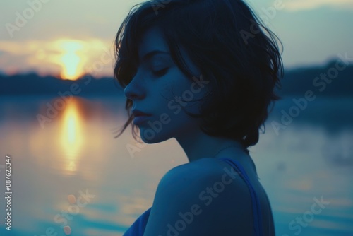A woman is standing in the water with her back to the camera. The water is calm and the sky is orange. The woman is lost in thought