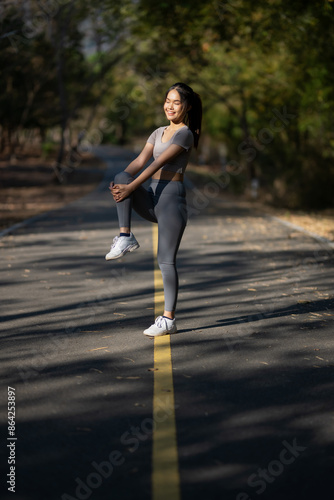 A woman is stretching on a road