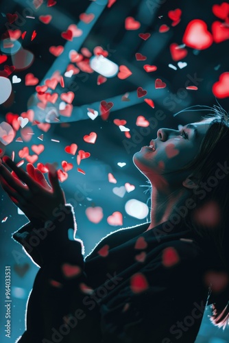 A woman is surrounded by a cloud of red hearts. She is reaching out to catch them. Concept of love and affection