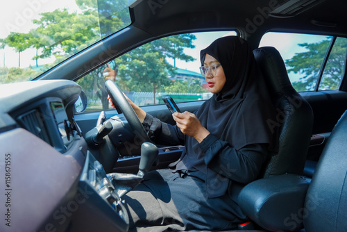 A woman is talking on her cell phone while driving a car. She is wearing a black hijab and is driving a white car