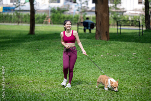 A woman is walking her dog in a park