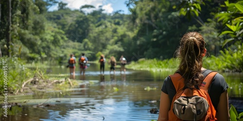 A woman is walking in a forest with her friends. She is wearing an orange backpack and has her hair in a ponytail. The group is walking along a river, and the water is calm