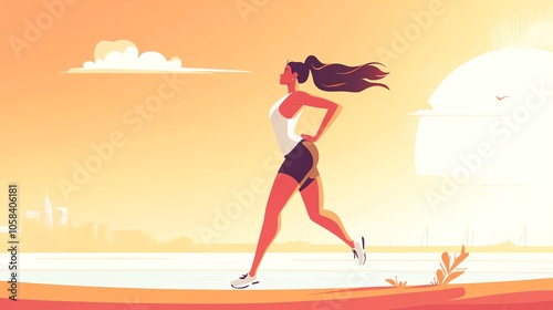 A woman jogging at sunset along a scenic path, showcasing fitness and vitality against a vibrant backdrop.