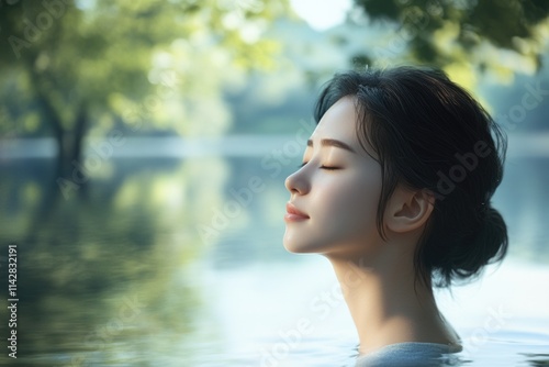 A woman lies on the surface of calm water, her eyes closed as she relaxes