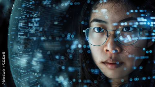 A woman looks intently at floating data projections in a dimly lit lab during a late-night research session