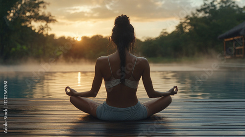 A woman meditating in peaceful solitude at sunset with a blurred background, symbolizing calmness, reflection, and inner peace with open space for inspiration