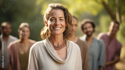 a woman mentor in a serene nature retreat, guiding a group of aspiring entrepreneurs through mindfulness practices, emphasizing the importance of well-being in business success.