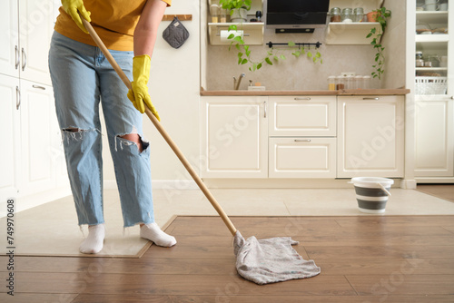 A woman mops the floor in her home kitchen. Female hands in yellow gloves while cleaning the kitchen