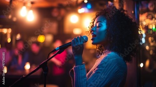 A woman passionately sings into a microphone on stage at an open mic night, surrounded by dim lights and an engaged audience enjoying the atmosphere