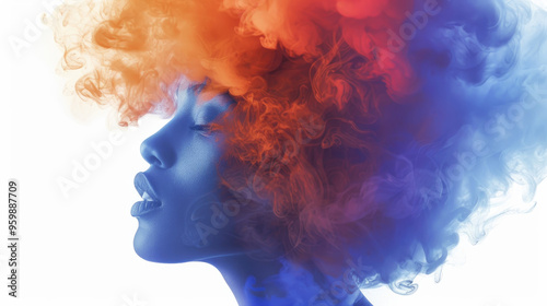 A woman peacefully poses with her head tilted, showcasing bold orange and blue swirls of color reminiscent of flowing smoke