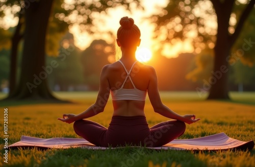 A woman practicing yoga in a serene park at sunset, surrounded by trees and lush grass