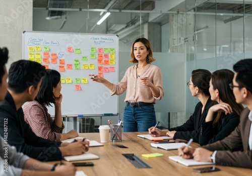 A woman presents ideas on a whiteboard to a group of colleagues in a meeting