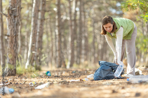 A woman removes rubbish in nature. High quality photo