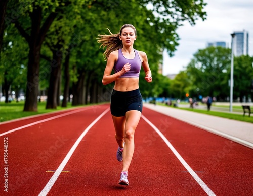 A woman runs along a red jogging track in a park. An athlete trains. A healthy lifestyle
