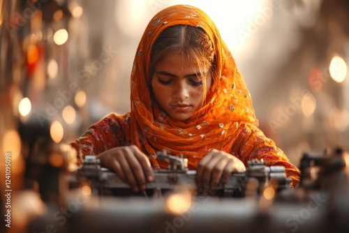 A woman sewing in a small, dimly lit factory, her hands rough from years of labor