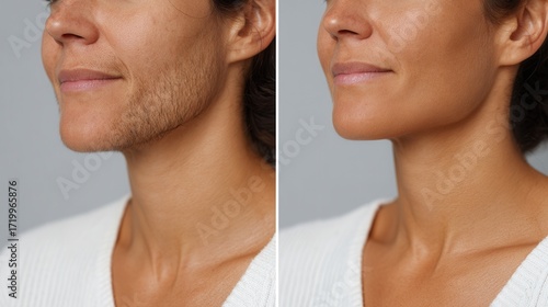 A woman showcasing her facial hair before and after grooming. The image highlights the transformation and beauty of personal care.