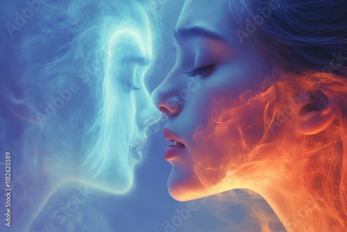 A woman sits calmly with her eyes closed, surrounded by a soothing blue background
