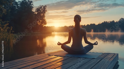 A woman sits in a meditative pose on a wooden dock, practicing mindfulness by a calm lake at sunrise, surrounded by serene nature.