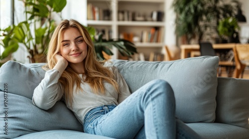 A woman sitting on a couch smiling at the camera, AI
