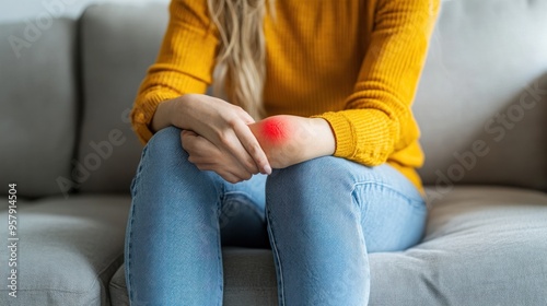 A woman sitting on a couch with her hand on her elbow, experiencing pain.