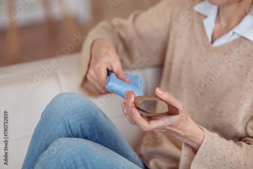 A woman sitting on the floor and putting on white cozy cotton socks on her feet