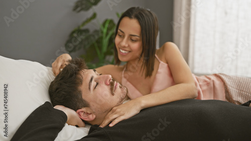 A woman smiles as she caresses a man resting his head in her lap, capturing a tender moment in a cozy bedroom setting.