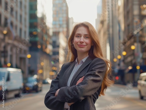 A woman standing confidently on a city street with her arms crossed, ready to take on the day