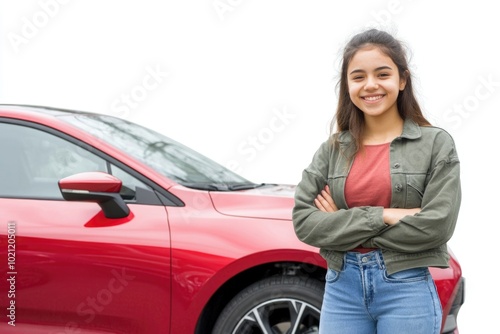 A woman standing next to a bright red vehicle, potentially waiting for someone or going somewhere