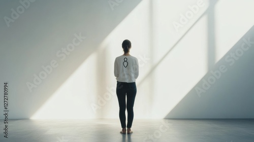 A woman standing with a coat hanger symbol in a public square. The soft morning light casts gentle shadows