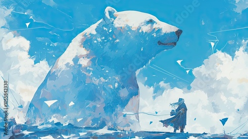 A Woman Stands Before A Giant White Bear Against A Blue Sky