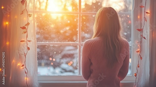 A woman stands by a window, admiring the beautiful sunset as it casts a warm glow into the room. The outside is covered with snow, enhancing the tranquil winter atmosphere