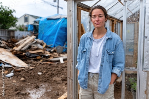 A woman stands confidently in a greenhouse surrounded by debris, symbolizing resilience and hope as she works to restore her garden and reconnect with nature.