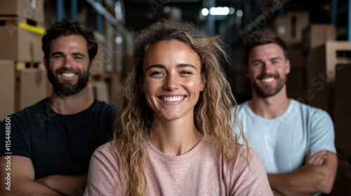 A woman stands smiling with her arms crossed in focus, flanked by two colleagues, all working in a bustling, organized warehouse environment.