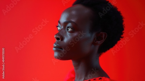 A woman stands with her attention drawn away from the camera, wearing a bright red shirt