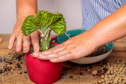 A woman transplants a houseplant, a flower in a ceramic pot.