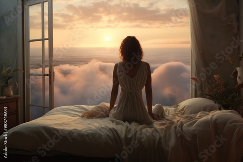 A woman waking up and sitting on the edge of the bed, ready to start the day, with a serene bedroom background